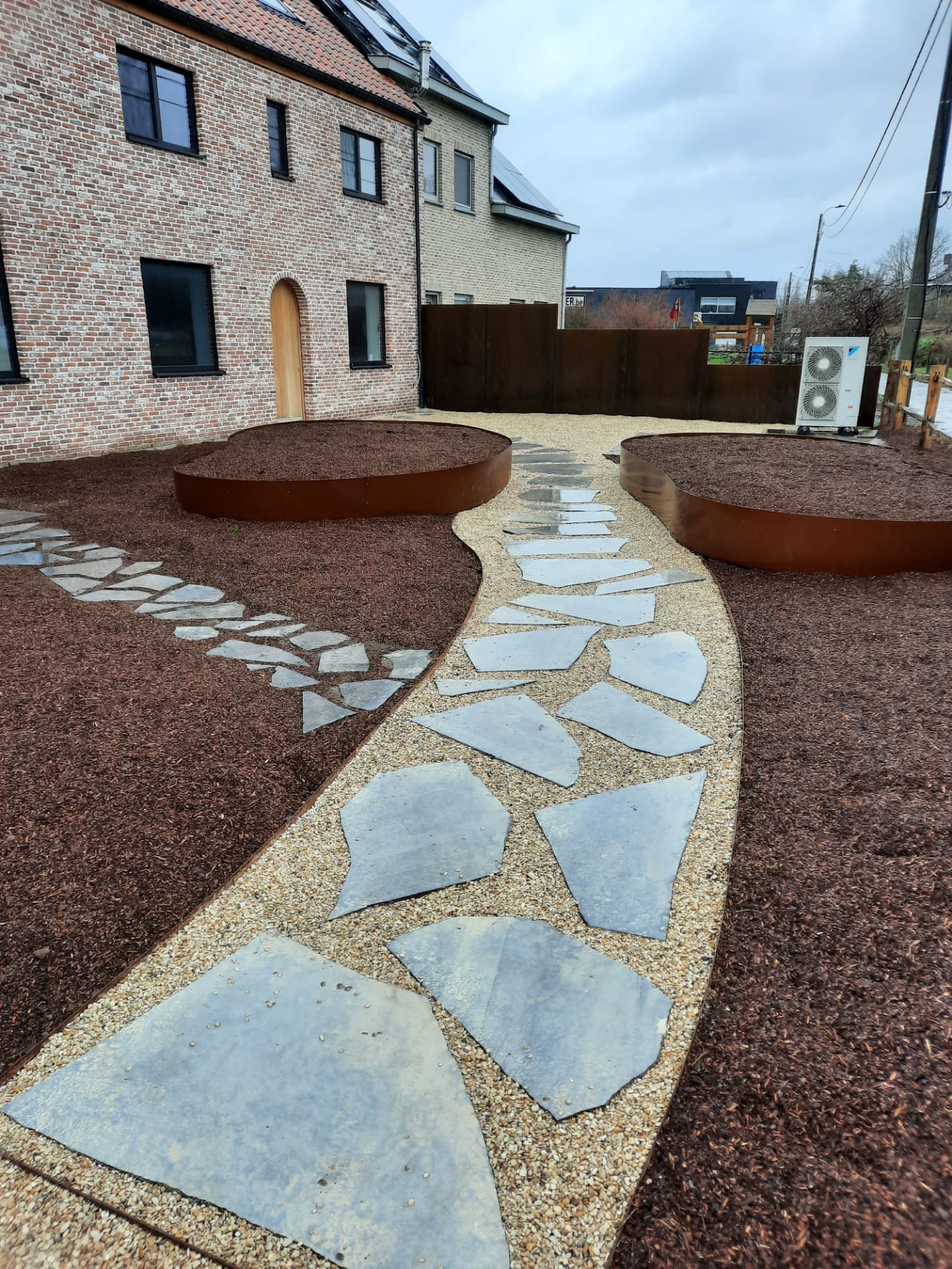 Voor dit project werd gewerkt met grote en kleine flagstones in Belgische arduin. De natuursteen werd gecombineerd met Houtse Marne siergrind, een afgerond grind dat door riviererosie zijn zachte vorm heeft gekregen. Dit type siergrind zorgt voor een rustiger en natuurlijker uitzicht dan scherp gebroken materialen.