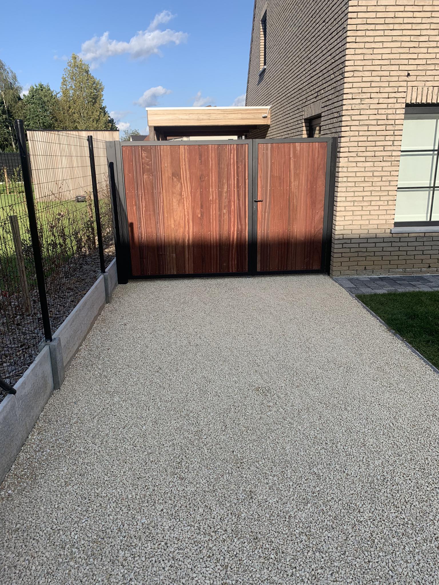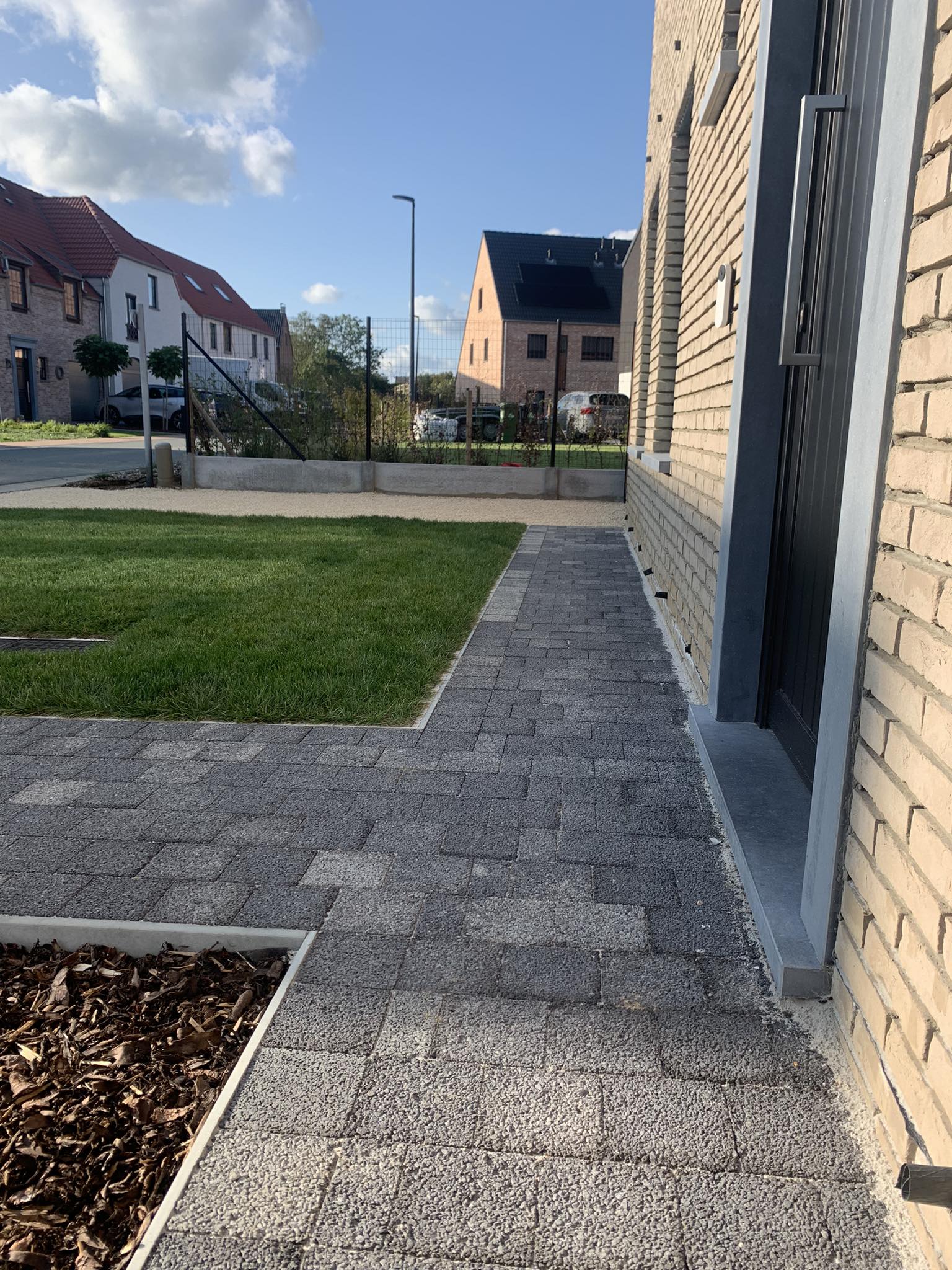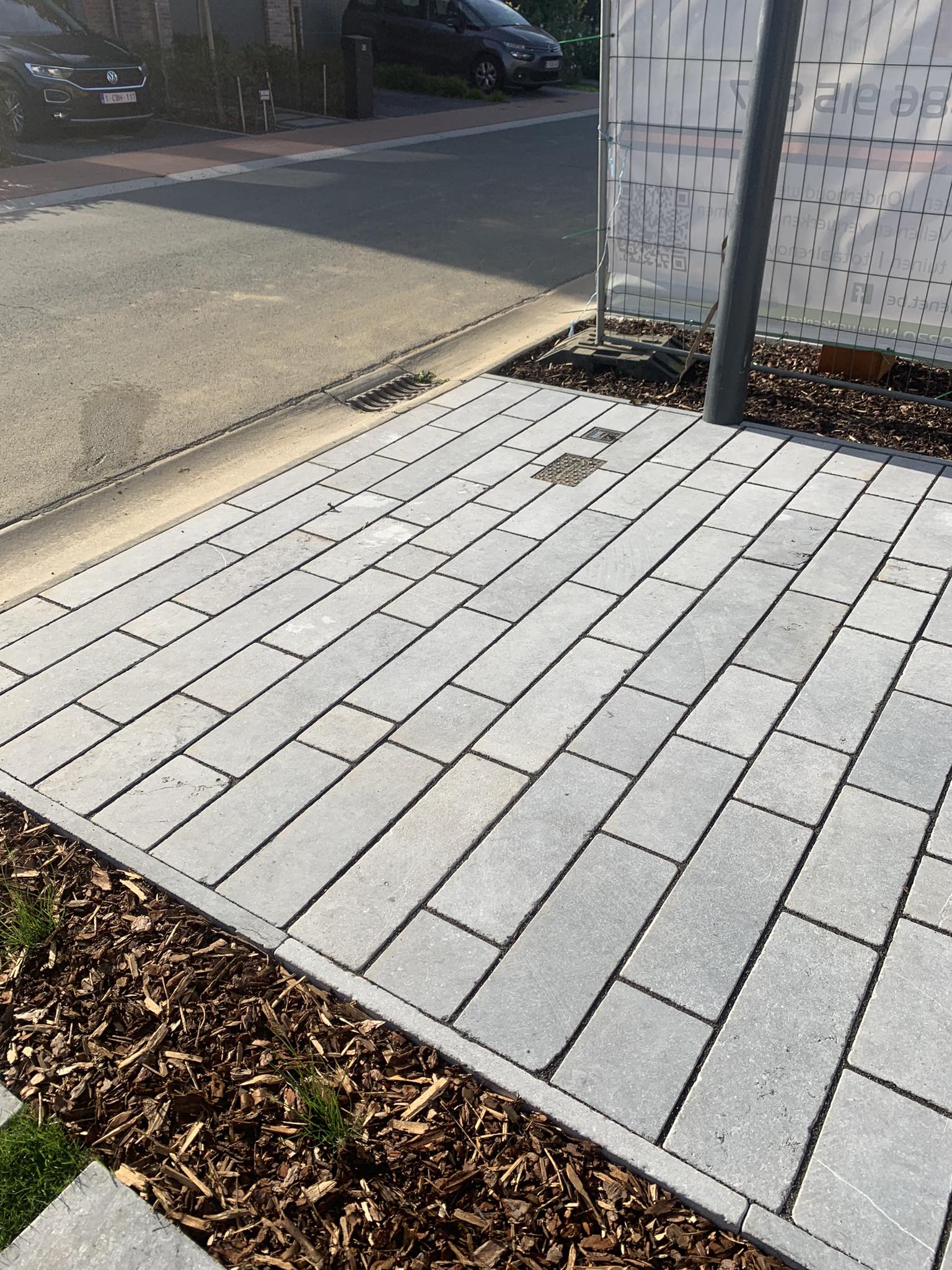 Voor dit project in de regio Aalst werd gekozen voor Belgische blauwe steen – Banen 20 in Pastorij Light afwerking, geplaatst met EcoSpacer. Deze combinatie maakt van de natuursteen een waterdoorlatende verharding, geschikt voor opritten en paden waar infiltratie een vereiste is. De Pastorij Light afwerking zorgt voor een genuanceerde, verouderde uitstraling die vaak toegepast wordt in landelijke en residentiële projecten in Vlaanderen.