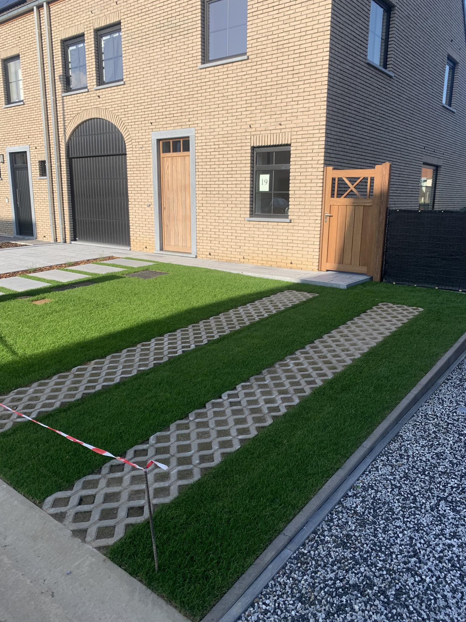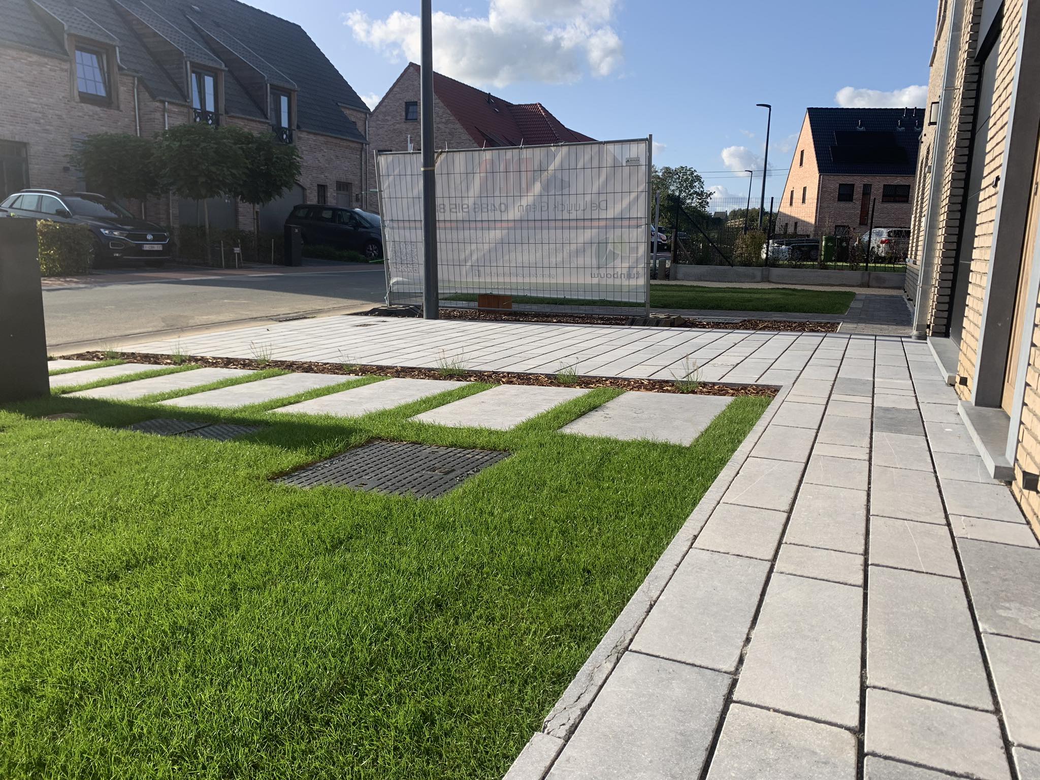 Aan het aanliggende woonhuis werd gewerkt met waterdoorlatende betonklinkers in cottage afwerking in het formaat 15×15×6, gecombineerd met grijze betonboordstenen en kasteelwit grind in witte grindmatten. Voor de extra parkeerzone werden grijze grasdallen toegepast.