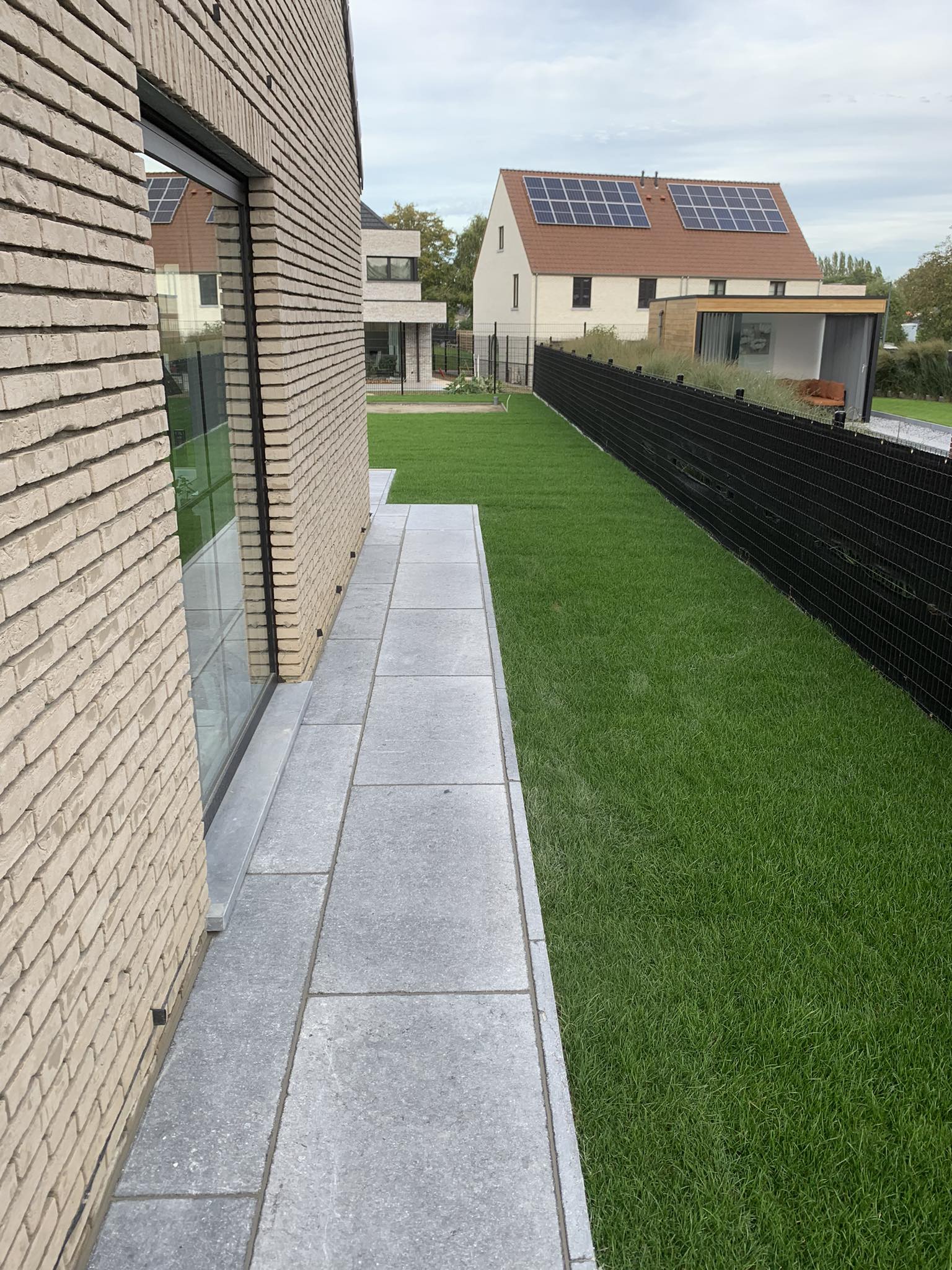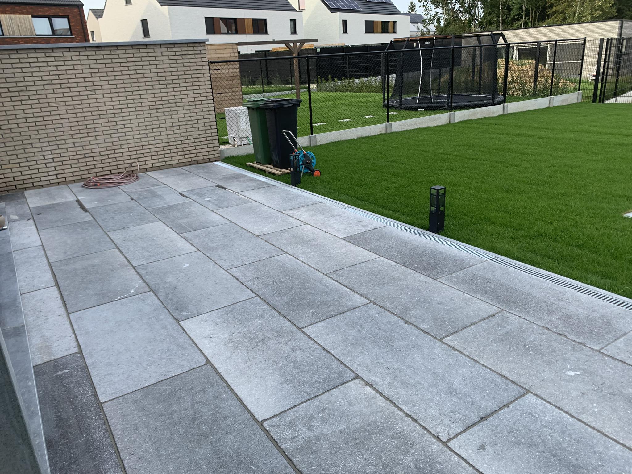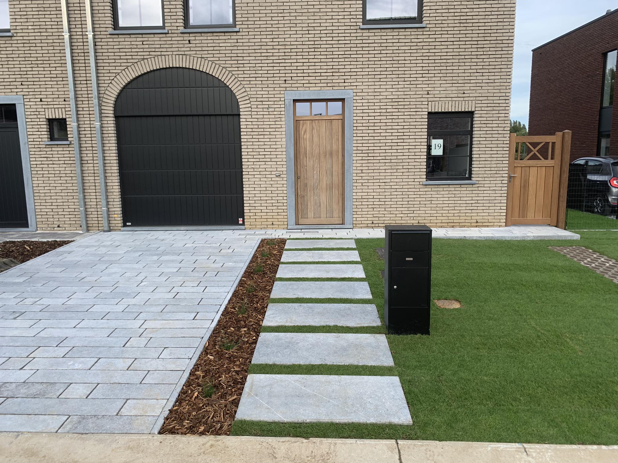 Daarnaast werden Belgische blauwe steen stapstenen 120×60 toegepast, eveneens in Pastorij Light afwerking, zodat materiaal en afwerking perfect op elkaar aansluiten binnen het totale ontwerp.